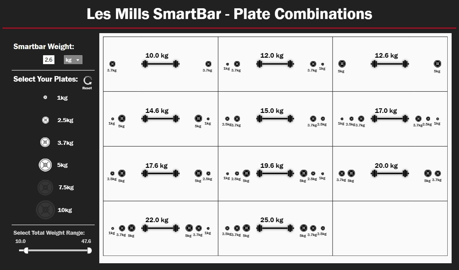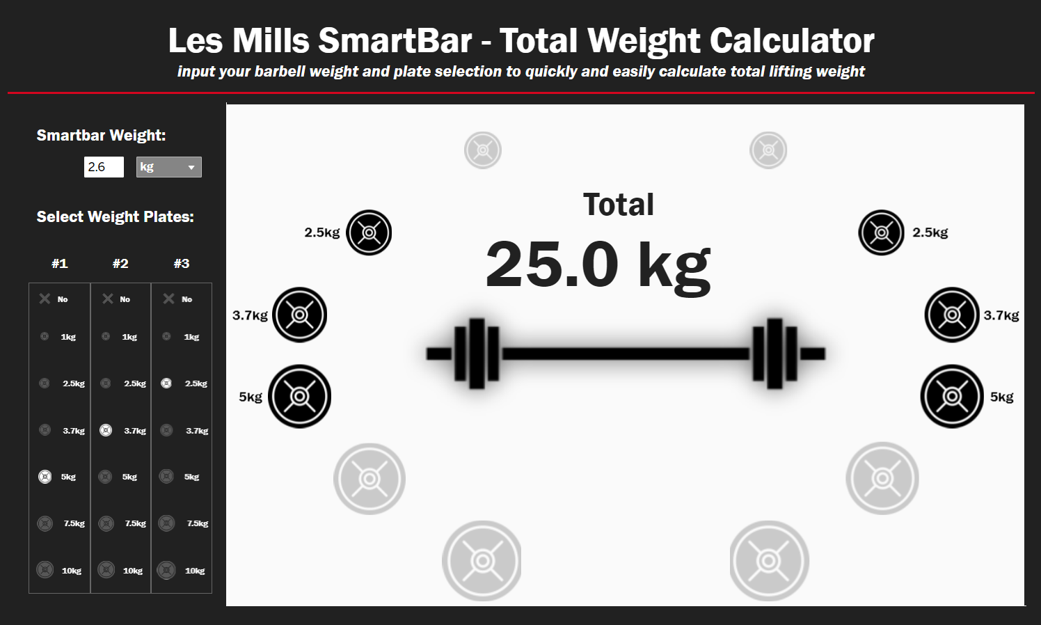 This app was created for Les Mills SmartBar, which is 2.6kg/5.8lbs. However, the weight can be adjusted for any barbell. There are three slots available to hold plates and those slots are filled by clicking on the relevant weight.